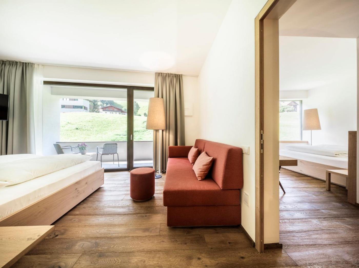 Superior Double Room. This elegant room has contemporary décor, carpeted floors and a balcony complete with table and chairs. Some rooms feature a glass wall dividing the room from the bathroom. Some rooms overlook the ski slopes, others face the garden. ;
